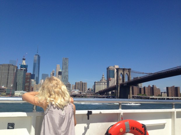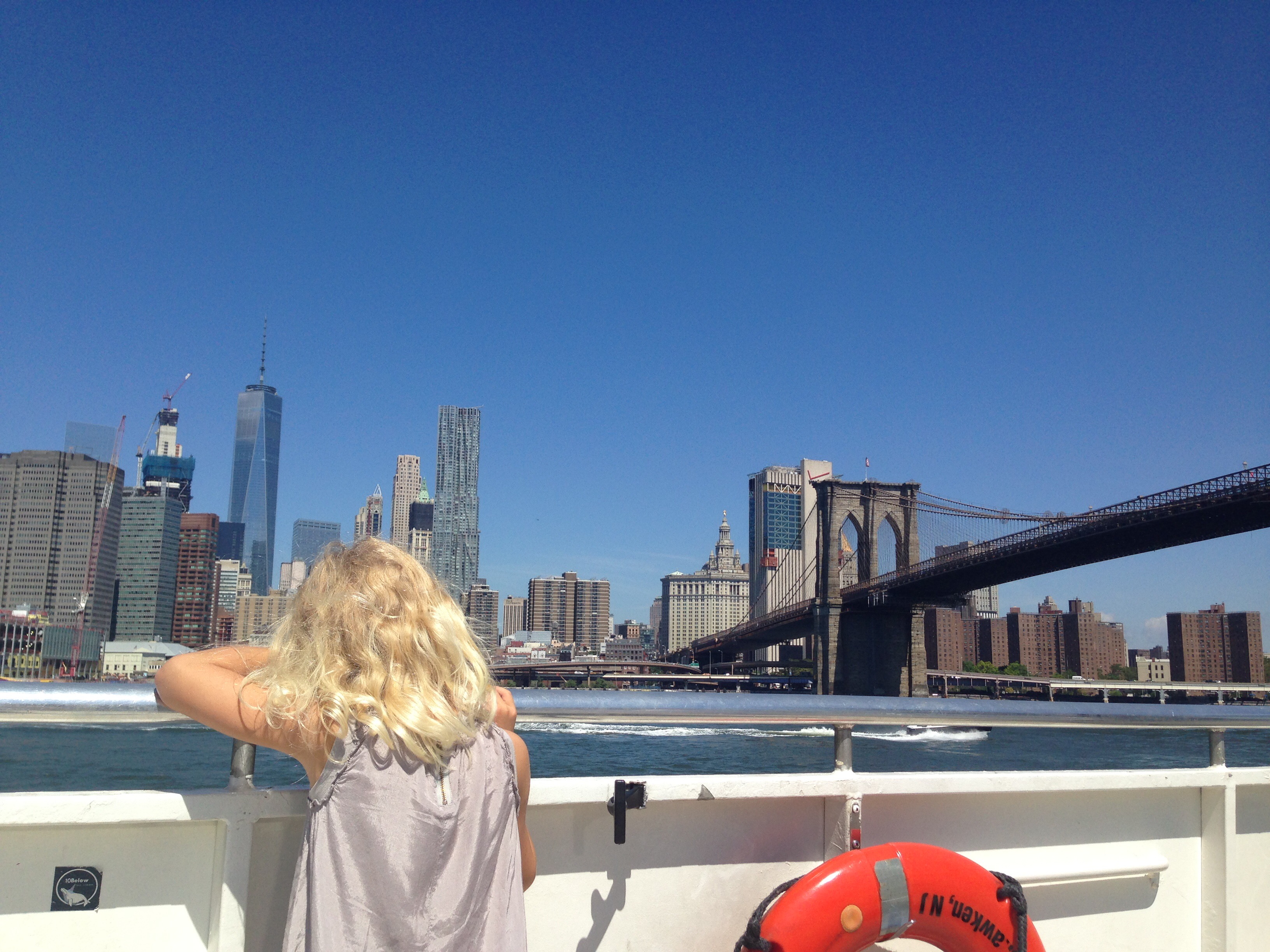 Men tilbage til turen i morges og hvorfor den betager mig. Vi sejler med Manhattan og alle dens enorme høje bygninger på vores højre side og Brooklyns rå og industrielle bygninger på modsatte side. Undervejs sejler vi først under Williamsburg Bridge, dernæst Manhattan Bridge og til sidst den ikoniske Brooklyn Bridge mens vi aner Frihedsgudinden forude. Kan virkelig anbefales. Og så er det jo ekstra smukt når himlen er blå og temperaturen er på ca 35 grader.