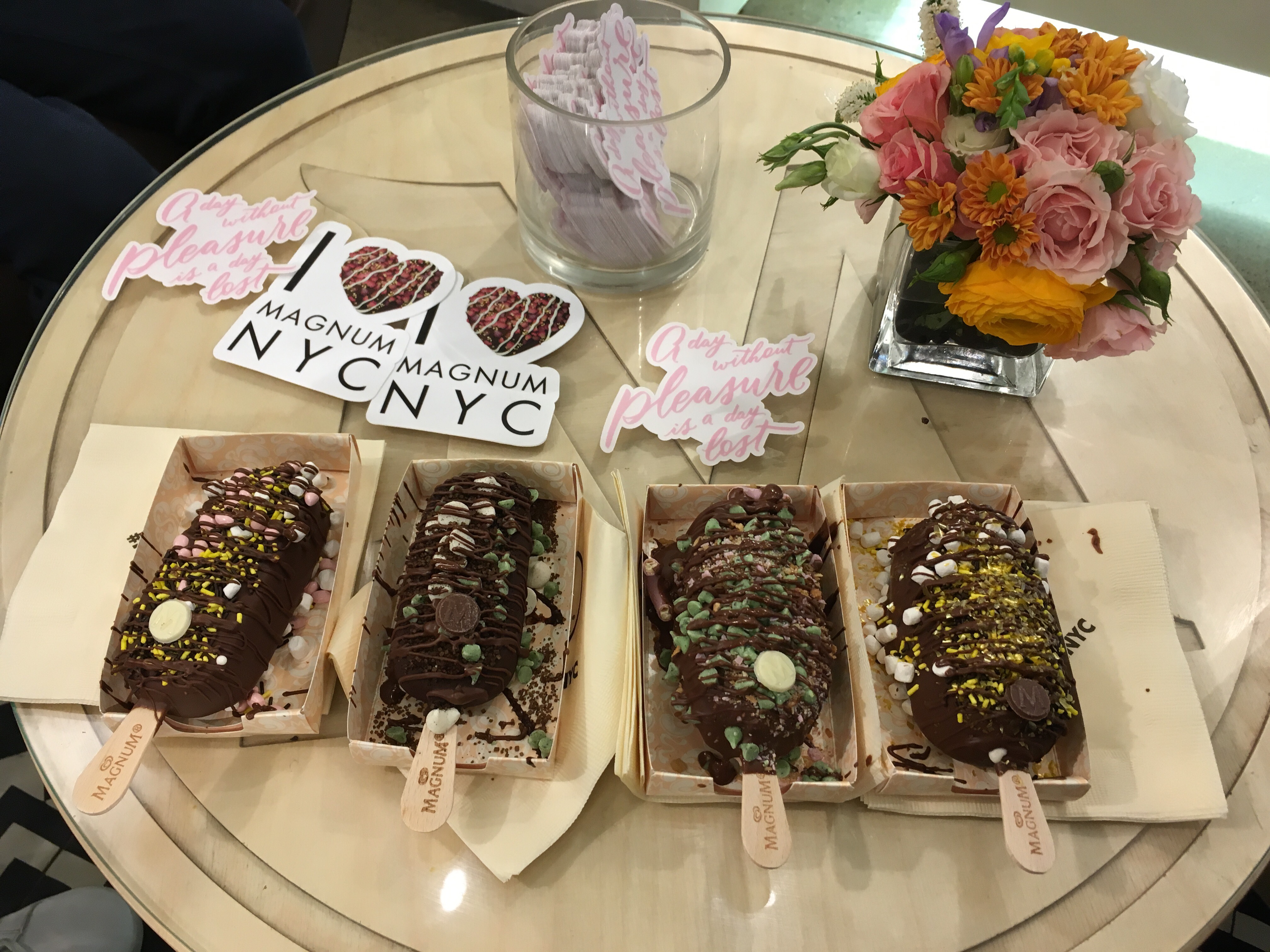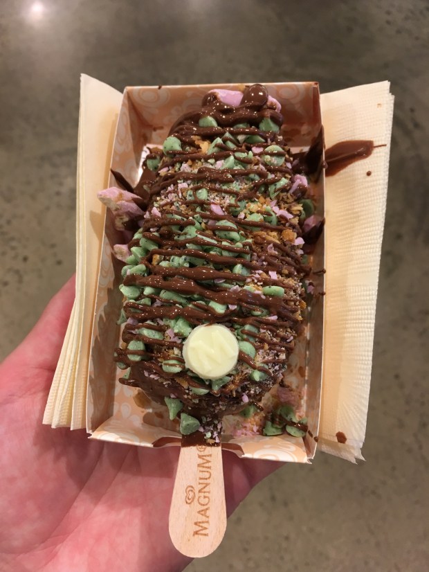 I weekenden fik vi en forsmag på det efterår, som langsomt er kommet snigende sig ind på os. Det markerede vi ved, at vi lørdag tog til SoHo for at smage på en næsten hjemmelavet Magnum. Man bestemmer selv, om det skal være vanille eller chokolade. Dernæst mørk eller lys chokoladeovertræk og så vælger man tre forskellige slags krymmel ud af et godt udvalg toppings. Der er pop-up butikker mange steder i verden, og selvfølgelig også her. Den lukkede i går søndag, så det var ved at være sidste chance. Resultatet så sådan ud: