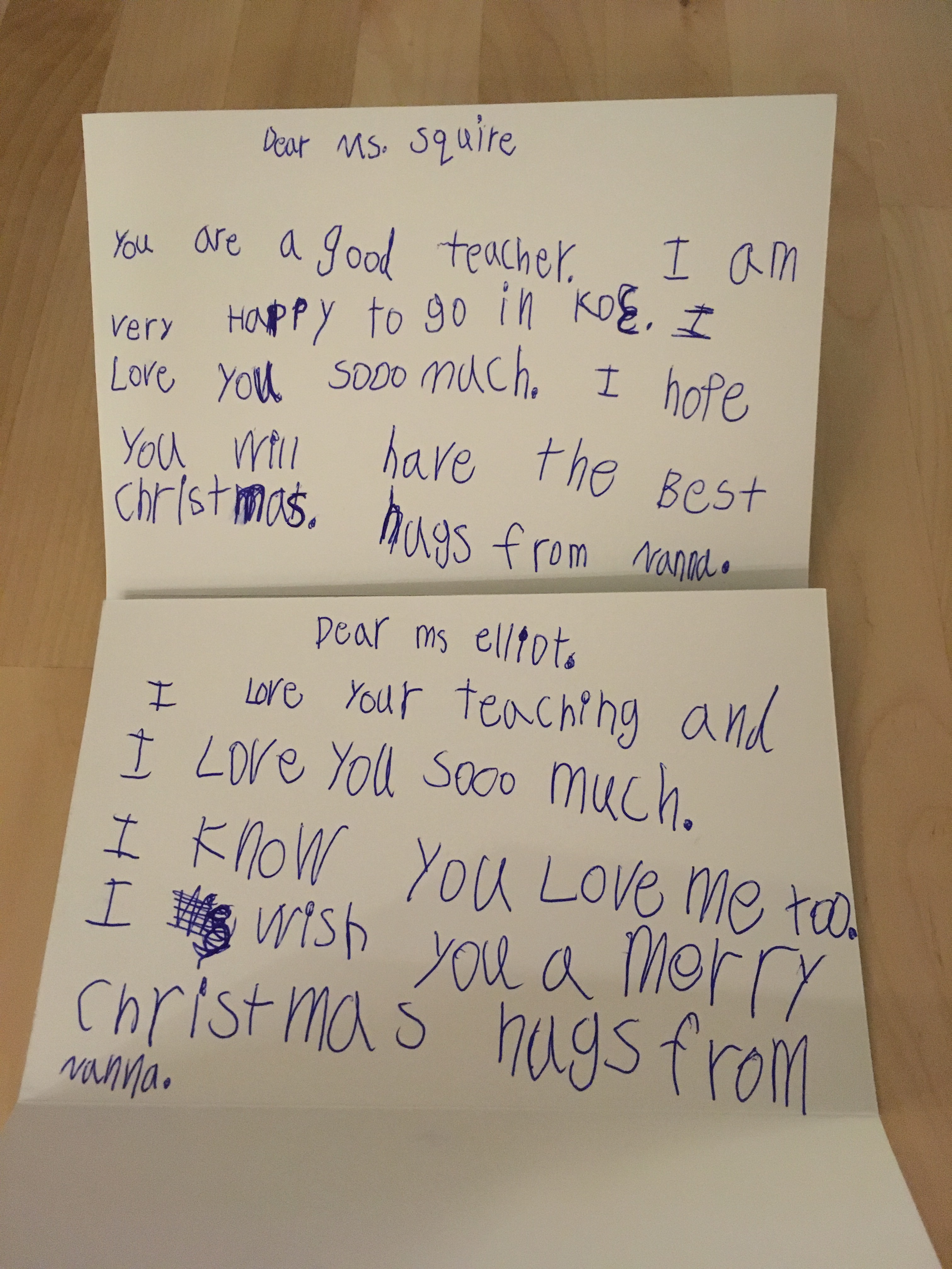 Nanna derimod har virkelig taget amerikanermentaliteten til sig og smider om sig med superlativer og skamroser alt og alle så snart hun ser sit snit til det. Således ser julekortene til hendes to skønne lærere ud: