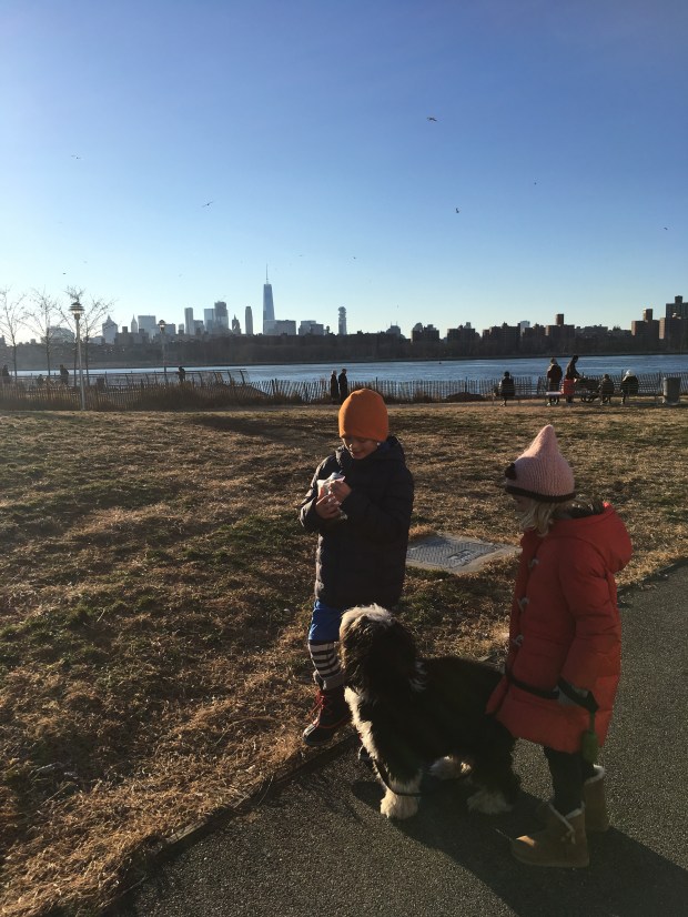 Kl.23 da hunden skulle luftes, gik Nanna og Michael med ham imens Emil og jeg gjorde klar til TVhygge på sofaen. Vi blev enige om, at vi ville bytte det festlige outfit ud med vores familiepyjamas (som blev tildelt hvert familiemedlem den 25.december om morgenen, Michael har endnu ikke iført sig sin.. forstår det ikke, den er ellers god stor og i noget meget blødt grønt- og sortternet flonel). Nanna var ikke sen til at smide den lyserøde læderjakke (som hun samme dag havde fået tilsendt fra bedste naboerne) for at iføre sig førnævnte pyjamas. Vi lavede sofaen om til en seng, hentede dyner og puder og så tv fra Times Square (så ikke Mariah Careys optræden, læste på de danske medier, at det vist var lidt pinligt – ligesom jeg har læst om “fadæsen” med YouSee, og hvis man starter sit 2017 med at smide om sig med eder og forbandelser over “fadæsen”, så er der altså nogle der får et laaangt 2017 – dertil har jeg kun én ting at sige; læs Hella Joof’s nye bog Papmachéreglen). Nå men tilbage til sofahyggen med de bedste. Jeg må ærligt indrømme, at jeg ikke kan huske ret meget af, hvad vi egentlig så, og det har ikke noget at gøre med god hvidvin, men nok nærmere det gode selskab, et par bløde puder, en dyne og det grønne- og sortternede flonel, som vil gøre enhver enormt søvnig (lige bortset fra vores børn). I hvert fald vågnede jeg kl.23.55 da Nanna siger, at nu er der kun 5 minutter til vi skal hoppe. Michael bliver vækket (!) og så er vi alle fire klar til at hoppe fra sofaen ind i det nye år. Vi sad derefter i vores stue og så over mod Times Square, men det var begrænset, hvad vi kunne se af fyrværkeri, det var mere røgen derfra samt lidt farverige lysglimt. Det er ikke lovligt at fyre fyrværkeri af i New York, det plejer at være koncentreret omkring nogle få steder, som fx Times Square. Himmelen her bliver ikke oplyst af det store fyrværkerishow, så det er ikke det, man skal tage til New York for nytårsaften. Hvis man derimod er til store forsamlinger samt at blive stående det samme sted i minimum 9 timer uden at kunne komme på toilettet for udelukkende at se et glimt at “ball droppet” fra Times Square, så er det med at planlægge en tur til New York nytårsaften.