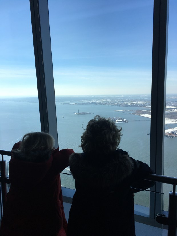 Én af de gode ting ved at have gæster (altså ud over hvor dejligt det er at se dem igen!) er, at vi kommer ud at se lidt seværdigheder. Vi har desværre en tendens til at dykke godt ned i hverdagen og dyrke det meget nære her i Williamsburg. Så da min søster for en uge siden var på besøg, og hun ytrede ønske om en tur til toppen af One World Trade Center tog det os ikke mange sekunder at stemme i og få bestilt billetter. Vi bestilte billetterne hjemmefra for at slippe for billetkøen ved indgangen. Der var nu fortsat kø til sikkerhedskontrollen, hvor sikkerheden er meget lig den man møder i lufthavnen. Jeg måtte dog gerne beholde både vandflaske og min tube håndcreme – vigtige sager på 102.etage 😉