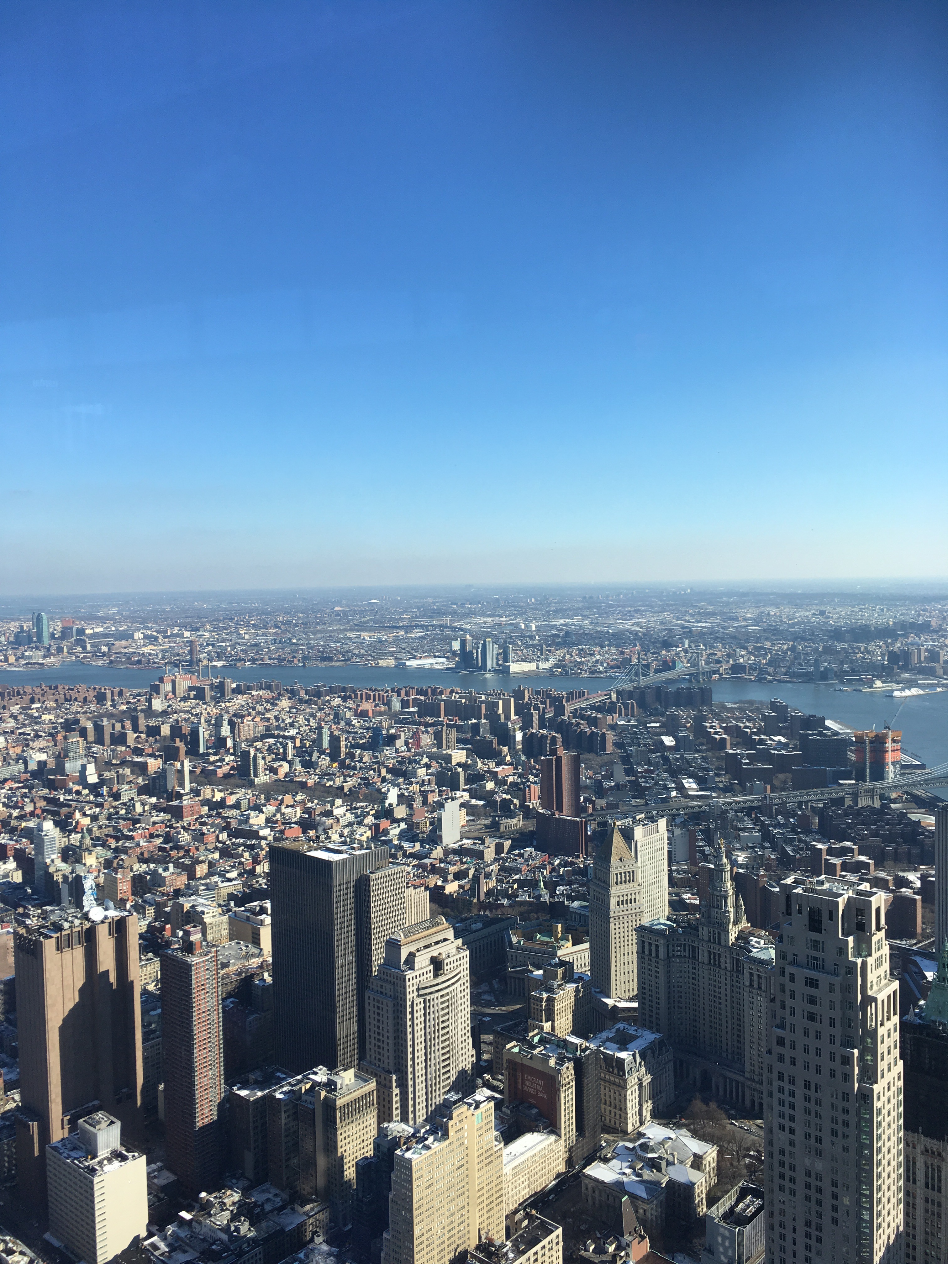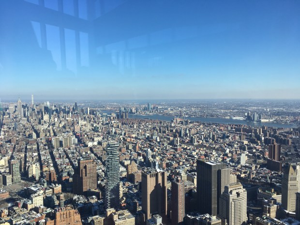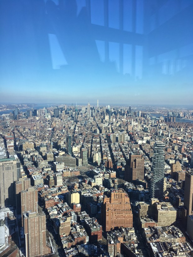 Vi bliver ledt en etage ned, hvor der er en 360 graders view over New York og New Jersey. Vi var super heldige med vejret, for der var ikke en sky på himmelen, så vi kunne se ret langt. Det hele blev dog en smule mere spændende, da et fly flyver ret direkte mod os for én af indflyvningsruterne drejer åbenbart af ikke langt fra toppen af tårnet. Efter vi så det, var der et par af familiemedlemmerne, som gerne ville (sikkert) på landjorden igen.. 😊