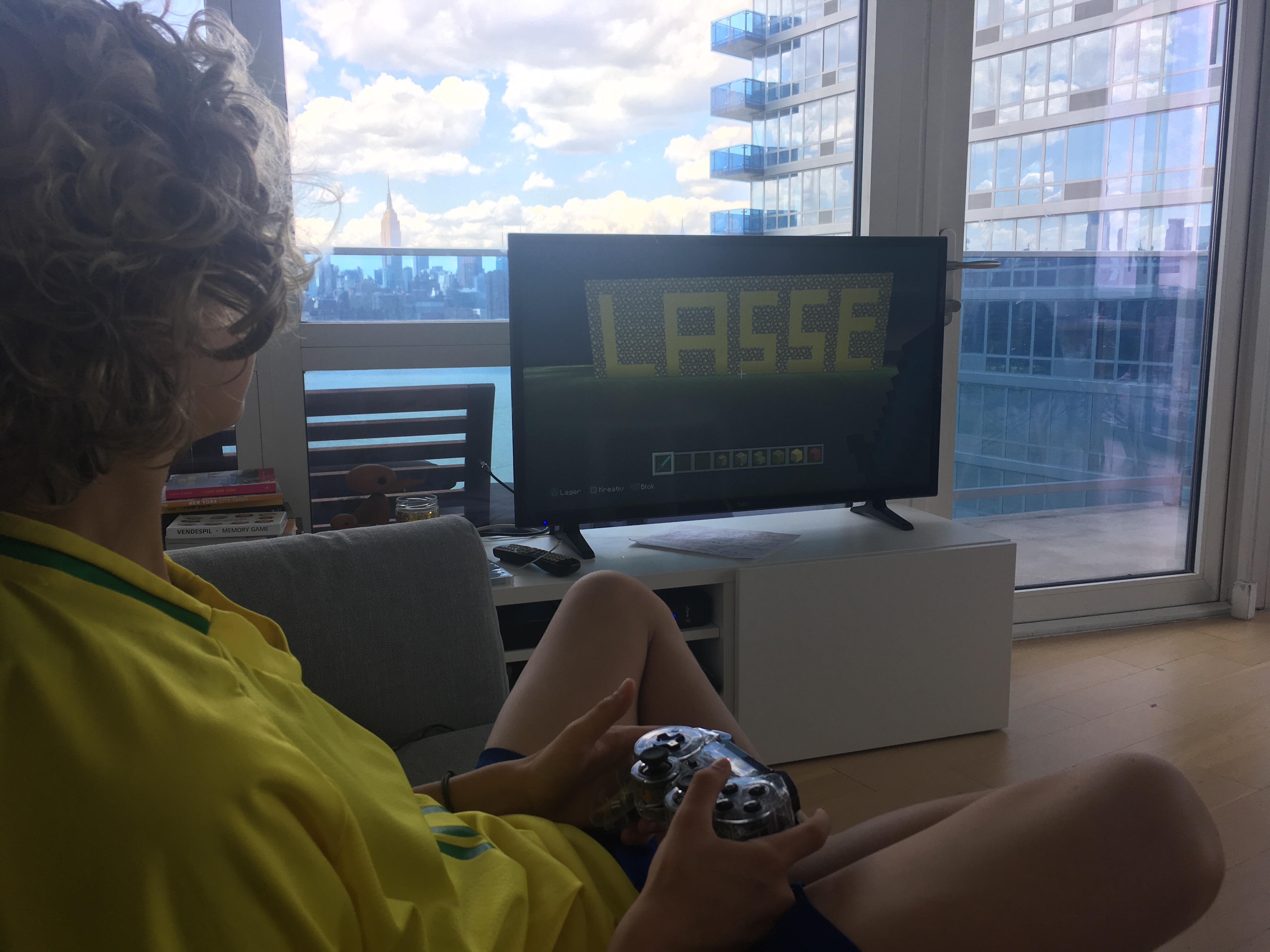 Da elevatordøren har lukket sig omkring dem, brød både Emil og Nanna, om muligt, endnu mere sammen, så jeg fik samlet begge børn op og ind i sofaen, hvor de begge græd så utrøsteligt, at jeg havde svært ved at finde de rigtige ord. Måske de ikke fandtes, for det eneste de havde lyst til, var at de andre skulle blive til vi rejser hjem, eller endnu bedre, at vi kunne have rejst med dem hjem. Emil fandt efter lidt tid Minecraft frem på PlayStation og forsvandt ind i den verden han og Lasse havde bygget. Der skrev han “LASSE” foran det store hus, de havde bygget, og som de havde aftalt, at de skulle bo i rigtigt, når de engang flytter hjemmefra sammen. Da han begyndte at skrive, løb tårerne ned ad mine kinder, for det er da så rørende og sikke en stærk og kærlig venskabserklæring. Derefter fik jeg en virtuel tour i deres store hus, og så var han klar til, at vi kunne gå ned i CVS for at købe en masse farverigt amerikaner snolder at trøste os med her i eftermiddag.